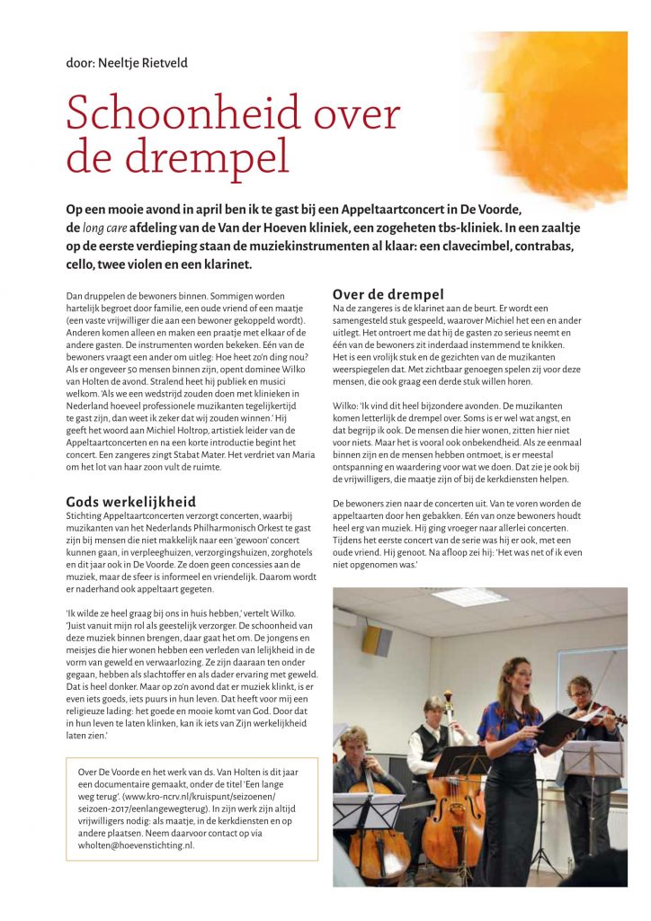 Wilko van Holten, geestelijk verzorger in TBS kliniek de Voorde, schreef een uitgebreid artikel in het Tijdschrift Geestelijke Verzorging over de Appeltaartconcerten in zijn kliniek.