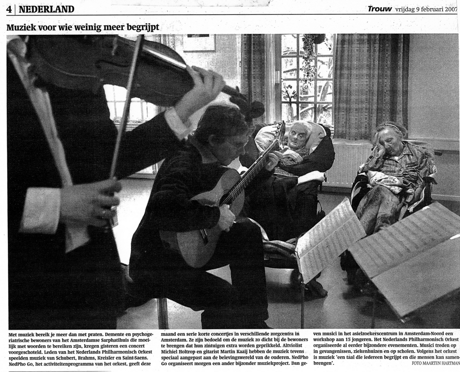 “Dit is het zinvolste werk voor een musicus: om de mooiste klassieke muziek te spelen voor dankbare (en soms heel zieke) mensen,” zegt Michiel. Mijn grootmoeder is de aanleiding geweest van onze succesvolle Appeltaartconcerten. Voor haar was muziek ook belangrijk: ze zong in een koor en kwam vaak naar mij luisteren toen ik studeerde aan het conservatorium. Apetrots was ze! En ze betaalde mee aan mijn prachtige altviool (gemaakt door Max Moller in 1954). Toen ze later, in 2007, flink achteruit ging besloot ik voor haar en haar medebewoners van de zorginstelling een concert te geven. Iedereen was ontroerd. Ook mijn grootmoeder, die mij overigens niet meer herkende. Maar we raakten vele snaren en het werd een geweldig succes. Dagblad Trouw, Radio4 en TVzender AT5 brachten verslag uit. Hierboven ziet u het artikel in Trouw.