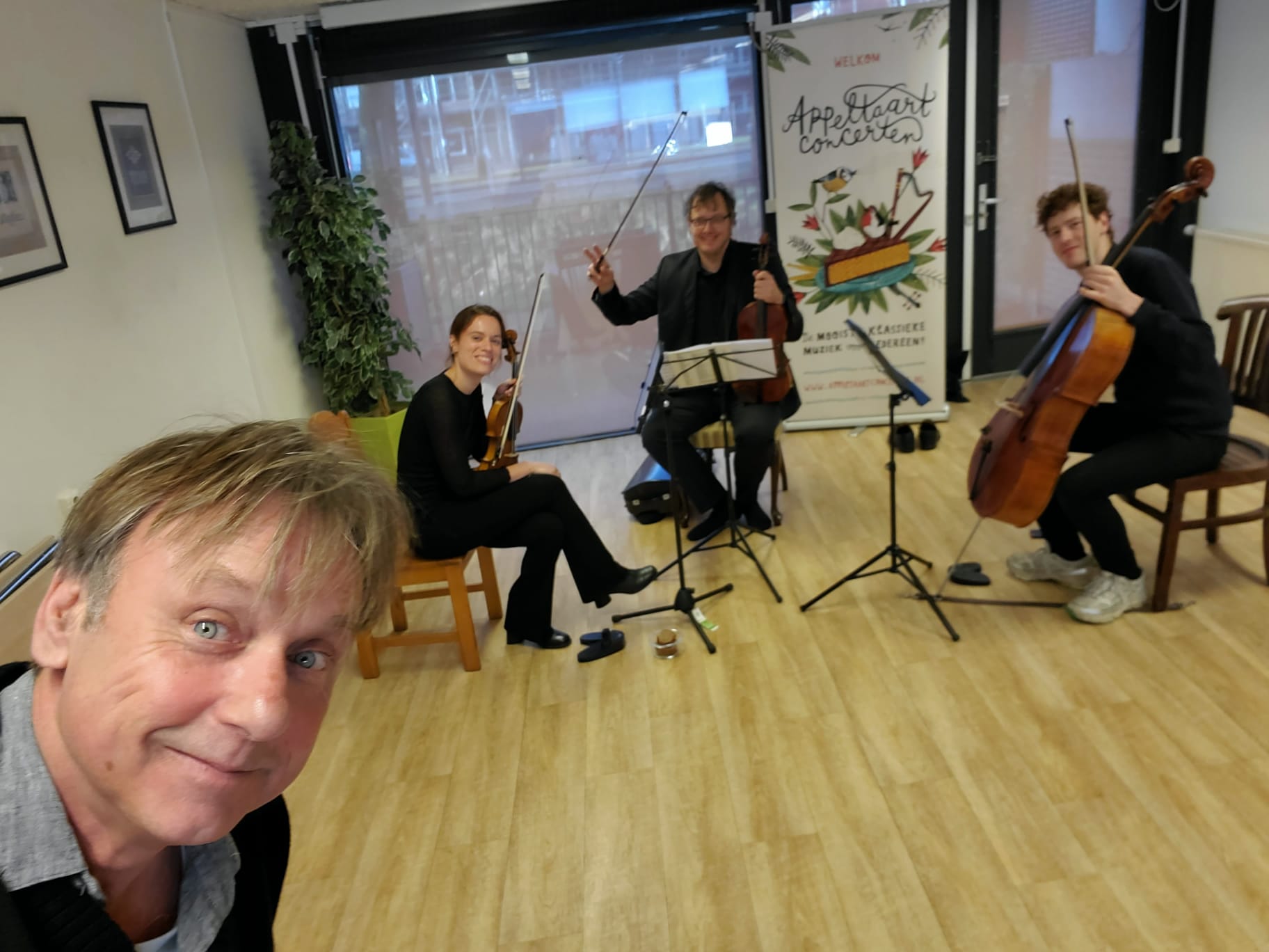 Strijktrio Appelfusie (Charlotte Basalo, Michiel Holtrop en Kalle de Bie) speelt passende stemmige, vrolijke muziek van Bach, Boccherini en anderen.